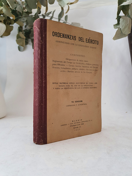Publicado: Madrid: Casa Editorial Hernando 1949 Autor: VV.AA. Título: Ordenanzas del ejército. Armonizadas con la legislación vigente. Encuadernación: Encuadernación de tapa dura Estado: Bien Información adicional: 8vo. 338 pp. Cartoné con el lomo en tela. En buen estado.