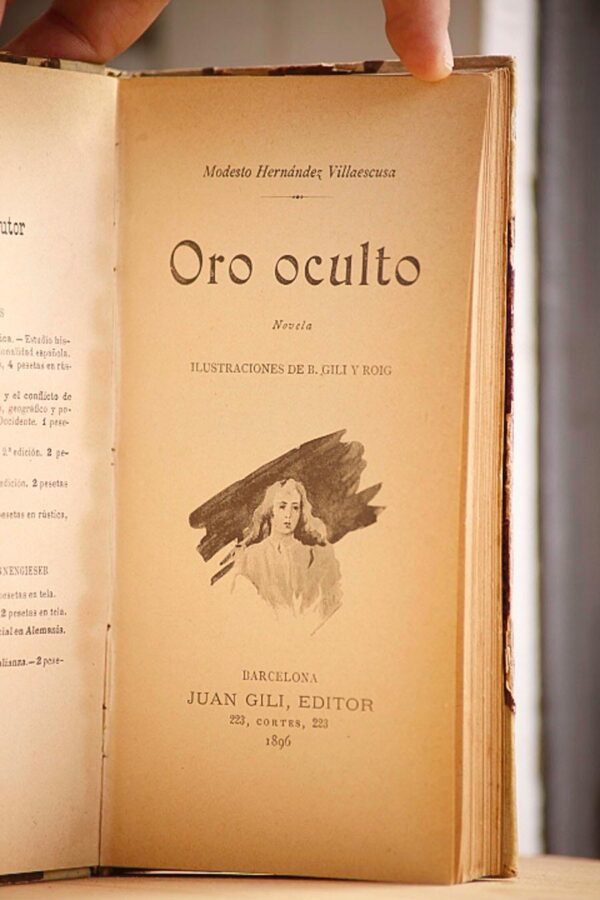 Publicado: Barcelona: Juan Gili, 1896 Autor: HERNÁNDEZ VILLAESCUSA, Modesto. Título: Oro oculto. Encuadernación: Encuadernación de tapa dura Estado: Muy bien Información adicional: 8vo. 206 pp. Encuadernación holandesa pergamino a la romana /cartoné con puntas. Buen estado.