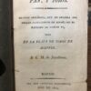 Publicado: Madrid: Por Don Santiago Fernández, 1812 Autor: JOVELLANOS, Gaspar Melchor de. Título: Pan y toros. Oración apológica que en defensa del estado floreciente de España en el Reynado de Carlos IV, dixo en la Plaza de Toros de Madrid D... Encuadernación: Rústica Estado: Muy bien Información adicional: 12mo. 32 pp. Rústica con cubiertas de papel. Buen estado. Introducción: El nombre de G.M. de Jovellanos, de quien es esta obrita, forma su mayor elogio. Su autor hace brillar en ella sus nobles ideas política (sic), y profundos conocimientos en todas materias, Ataca directamente el vicio, y critica los abusos introducidos por el fiero egoismo, y estupida ignorancia que debilitan los estados más bien organizados; procurando al mismo tiempo desterrar la superstición que desfigura la sana moral del Evangelio [...]