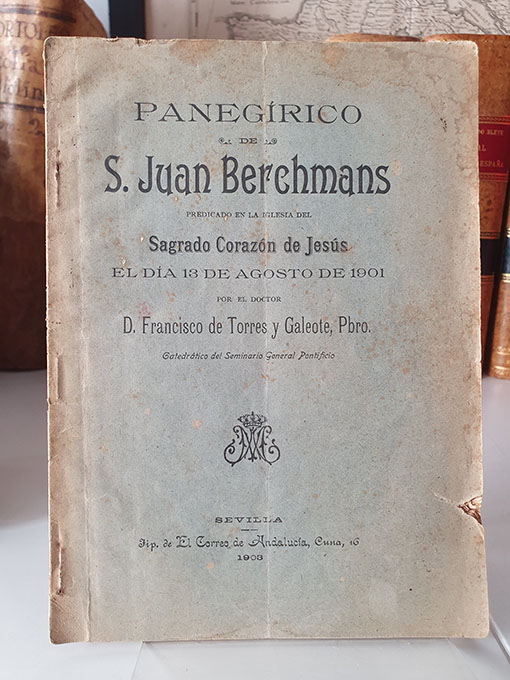 Publicado: Sevilla: Tip. de El Correo 1903 Autor: TORRES Y GALEOTE, Francisco. Título: Panegírico de S. Juan Berchmans. Encuadernación: Rústica Estado: Aceptable Información adicional: 4to. 18 pp. Rústica, fatigada.