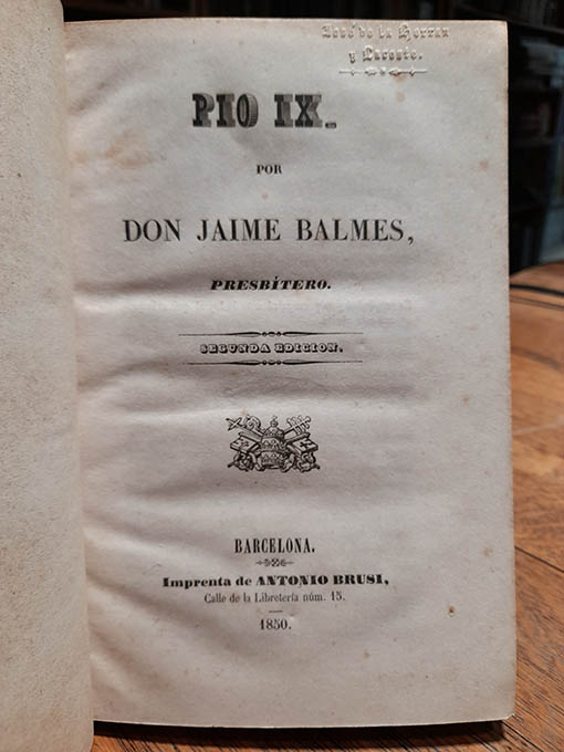 Publicado: Barcelona: Imprenta de Antonio Brusi, 1850 Autor: BALMES, Jaime. Título: Pio IX. Encuadernación: Encuadernación de tapa dura Estado: Bien Información adicional: 4to. menor, 94 pp. + 1 h. Holandesa de época. Lomo y puntas con alguna rozadura.