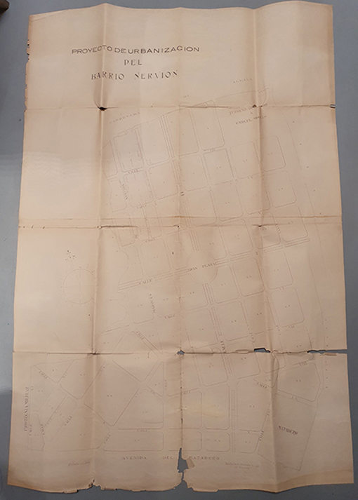 Título: Plano con el Proyecto de Urbanización de Nervión. Original de 1916. 133 x 89 cm. Encuadernación: Sin encuadernar Información adicional: 133 x 89 cm Roturas en dobleces y márgenes.