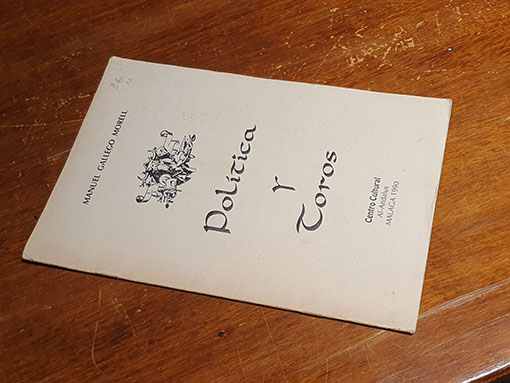 Publicado: Málaga: Centro Cultural Al-Andalus 1990 Autor: GALLEGO MORELL, Manuel. Título: Política y toros. Encuadernación: Rústica Estado: Aceptable Información adicional: 4to. menor, 24 pp. Rústica un poco manoseada.
