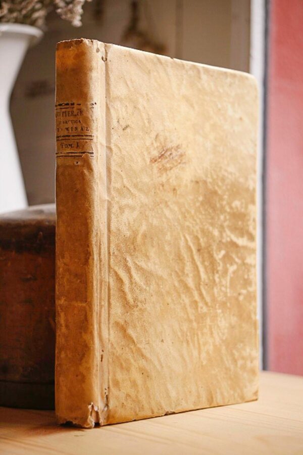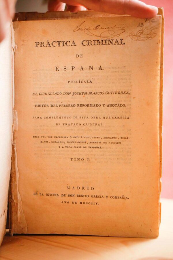 Publicado: Madrid: En la oficina de Don Benito García y Compañía, 1804 Autor: GUTIERREZ, Joseph Marcos. Título: Práctica Criminal de España. Tomo I. Encuadernación: Encuadernación de tapa dura Estado: Bien Información adicional: 4to. XIV pp. + 412 pp. Encuadernación pergamino de época con tejuelo en papel con título. Falto de guardas y, debido a la acidez del papel, algo de marronización de las páginas.