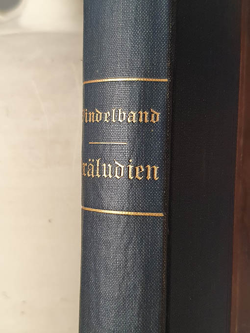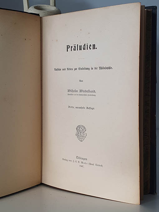 Publicado: Tübingen: Verlag von Mohr 1902 Autor: WINDELBAND, Wilhem. Título: Praeludien Aufsätze und Reden zur Einleitung in die Philosophie von...- Dritte, vermehrte Auflage Encuadernación: Encuadernación de tapa dura Estado: Bien Información adicional: 8vo. vi pp. + 1 h. + 463 pp. Holandesa tela-cartoné editorial. En buen estado. Pequeño desgarro de la tela en parte superior del lomo.