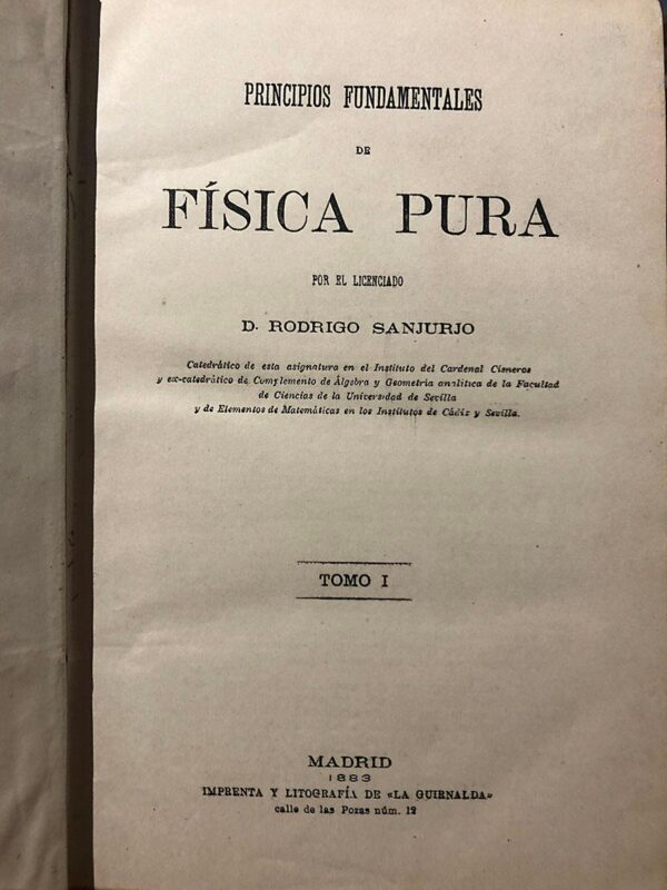 Publicado: Madrid: Imp. y Lit. La Guirnalda, 1883 Autor: SANJURJO, Rodrigo. Título: Principios fundamentales de Física Pura. Encuadernación: Encuadernación de tapa dura Estado: Bien Información adicional: 8vo. 595 pp. + 3 cromolitografías. Holandesa de época con color en lomo desvaído. Buen estado.
