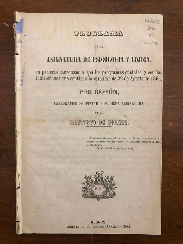 Publicado: Burgos: Timoteo Arnáiz, 1864 Autor: Besson Título: Programa de la asignatura de psicología y lójica (sic) Por... Encuadernación: Sin encuadernar Estado: Aceptable Información adicional: 8vo. 48 pp.