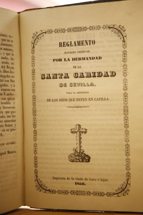 Publicado: Madrid: Viuda de Ibarra y Sevilla: Imp. de Caro e hijos, 1785-1856 Título: Regla de la muy humilde y Real Hermandad de la Hospitalidad de la Santa Caridad de N. Señor Jesuchristo, sita en su casa y hospital del Señor San Jorge de la Ciudad de Sevilla. Regla de la muy humilde y Real Hermandad de la Hospitalidad de la Santa Caridad de N. Señor Jesuchristo, sita en su Casa y Hospital del Señor San Jorge de la Ciudad de Sevilla. [Junto con] Aprobación de los Estatutos de la Hermandad de la Santa Caridad por Fernando VII a 27 de Septiembre. Con fecha, al final, 1831. [Junto con] Copia literal de la carta enviada de la ciuidad de Sevilla, escrita por D. Miguel de Mañara. exhortando a los Hermanos de la Santa Caridad de Antequera... 2 hojas. [Junto con]Reglamento para la Junta de Hacienda de la Santa Hermandad de la Caridad de la Ciudad de Sevilla. [Junto con] Reglamento para los entierros de los Hermanos y Pobres de la Santa Caridad de esta ciudad. Encuadernación: Encuadernación de tapa dura Estado: Bien Información adicional: I: VI pp.,+ 197 pp. + 2 láminas. II: 13 páginas en papel del s. XIX. III: 2 hojas. IV: 16 pp. V: 8 pp. VI: 8 pp. + 1h. VII: Todo encuadernado en holandesa del siglo XIX con puntas en pergamino, algo rozada. Interior en perfecto estado. Papel de hilo limpio y crujiente e impresión con negros profundos y bien definidos.