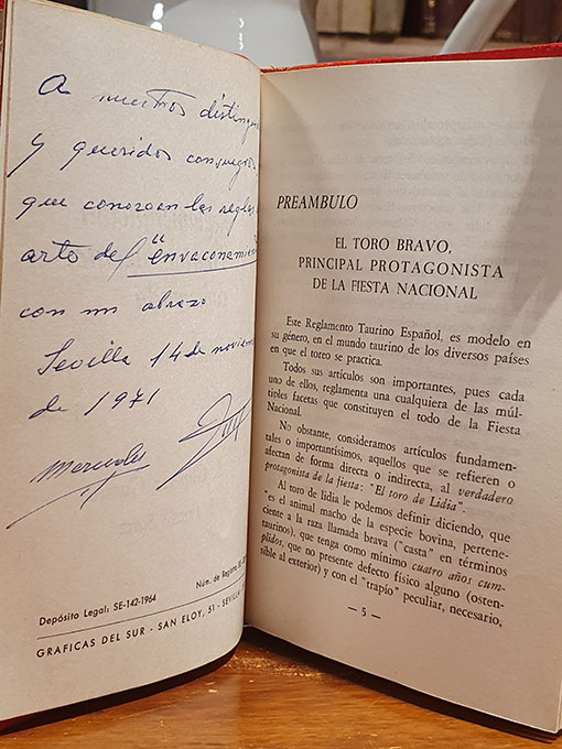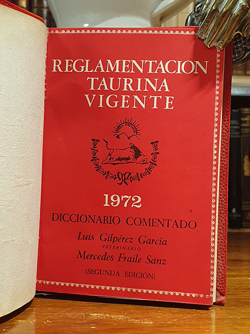 Publicado: Sevilla: 1972 1972 Autor: LUIS GILPEREZ GARCIA / MERCEDES FRAILE SANZ Título: Reglamentación taurina vigente. Diccionario comentado. Índice alfabético. Encuadernación: Encuadernación de tapa dura Estado: Muy bien Información adicional: 8vo. 232 pp. Holandesa con nervios y hierros en lomo. Dedicatoria autógrafa de los autores. Conserva ambas cubiertas originales.