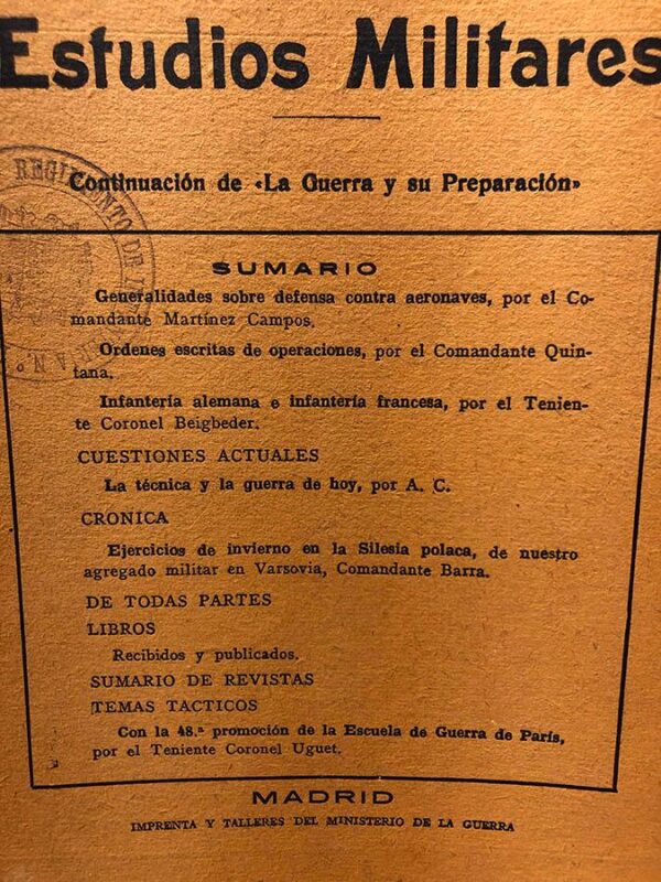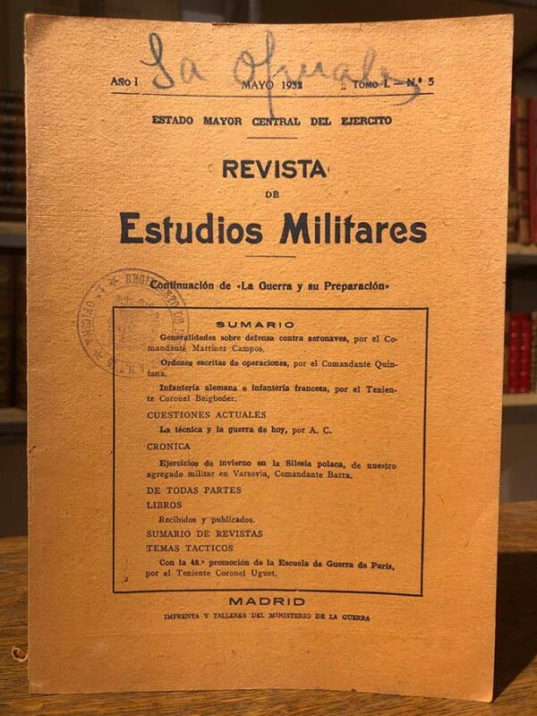Publicado: Madrid: Imprenta y Talleres del Ministerio de la Guerra, 1932 Título: Revista de Estudios Militares. Año I.- Tomo I.- No. 5. [Continuación de La Guerra y su preparación] Encuadernación: Rústica Estado: Bien Información adicional: 4to. páginas de 329 a 403 pp. + de la 57 a la 72 pp. Rústica levemente deslucida. Numerosos planos y estados plegados y varias páginas al final con publicidad de efectos militares y de armamento vario.