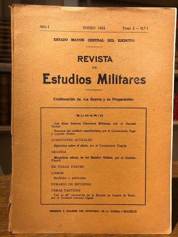Publicado: Madrid: Imprenta y Talleres del Ministerio de la Guerra, 1932 Título: Revista de Estudios Militares. [Continuación de La Guerra y su preparación] Año I.- Tomo I.- No. 1. Encuadernación: Rústica Estado: Bien Información adicional: 4to. 88 pp. + 4 h. Rústica levemente deslucida.