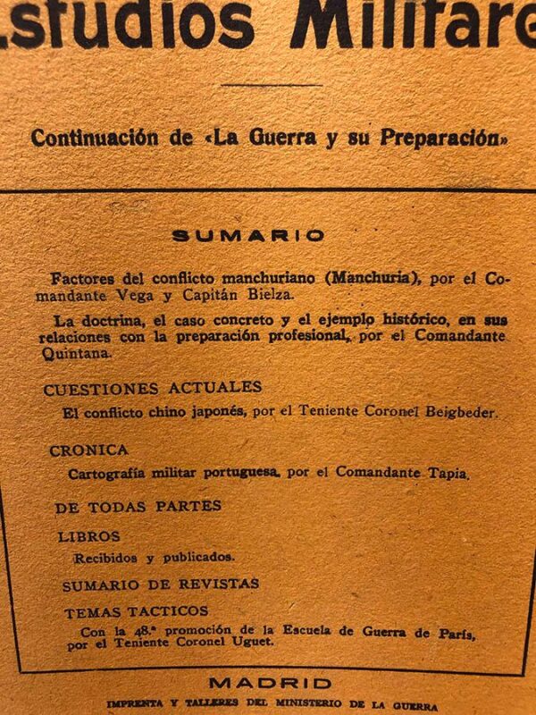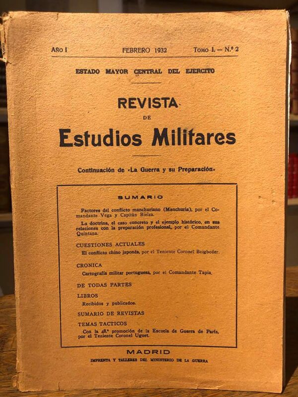 Publicado: Madrid: Imprenta y Talleres del Ministerio de la Guerra, 1932 Título: Revista de Estudios Militares. [Continuación de La Guerra y su preparación] Año I.- Tomo I.- No. 2. Encuadernación: Rústica Estado: Bien Información adicional: 4to. 169 pp. + 23pp. Rústica levemente deslucida. Numerosos planos y estados plegados y varias páginas al final con publicidad de efectos militares y de armamento vario.