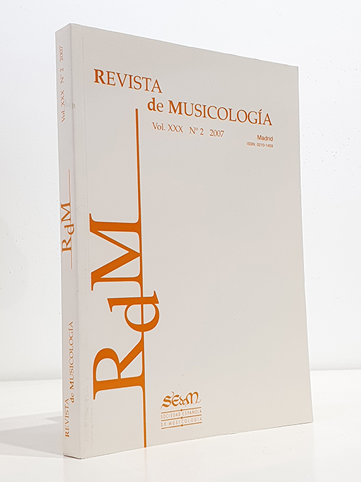 Revista de Musicología, vol. XXX, 2007, nº 2. Artículos: - Óscar Creus Ortolá: Características estilísticas en los motetes de Ginés Pérez (?-1600) - Omar Morales Abril: Características de estilo en la obra de Pedro Bermúdez (fl.1574-1604) - Miguel Bernal Ripoll: El temple de Soler: características y realización práctica - Xavier Daufí: Estudio de los recitativos de los oratorios de Francesc Queralt - Mª Esperanza Clares Clares: La música teatral en Murcia a través de la prensa local (1800-1851) - Esteban Elizondo Iriarte: El P. Nemesio Ontaño, S.J., principal impulsor del órgano en España en la primera mitad del siglo XX. - Belén Pérez Castillo: La Voz despojada. Algunos elementos de renovación vocal en la música española. - Roc Laseca: Sujetos metodológicos: 7 reflexiones + 2 emails para una musicología emergente. Tesis doctorales: - Javier Marín López: Música y músicos entre dos mundos: la Catedral de México y sus libros de polifonía (ss. XVI- XVIII) - Amanda Judith Alba González: Escuela Magistral de la Virtuosidad Pianística Moderna, de Alberto Jonás y sus ejercicios técnicos originales: convergencia de la ejecución pianística y el estudio teórico de la técnica. - Luis Carlos Anzaldúa González: La tratadística española del contrapunto severo desde el siglo XVIII al XX. Su metodología de enseñanza y los elementos que influyeron en su evolución hasta la conformación de los grandes tratados españoles. Reseñas bibliográficas: - Juan Pablo Fernández-Cortés: La música en las casas de Osuna y Benavente (1733-1882). Un estudio sobre el mecenazgo musical de la alta nobleza española. Madrid: Sociedad Española de Musicología, 2007, 589 pp. (María J. de la Torre Molina). - Nicolò Maccavino (ed.): La serenata tra Seicento e Settecento: Musica, Poesía, Scenotecnica. Atti del convegno internazionale di studi. (Reggio Calabria, 16-17 maggio 2003). Reggio Calabria: Edizioni del Conservatorio di Musica «F. Cilea» 2007, 2 vols, 746 pp. (José María Domínguez)