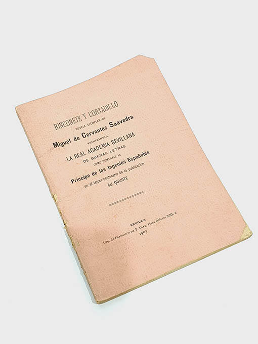 Publicado: Sevilla: Imp. de Francisco P. de Díaz 1905 Autor: CERVANTES SAAVEDRA, Miguel de. Título: Rinconete y Cortadillo. Novela ejemplar de... Reimprimela la Real Academia Sevillana de Buenas Letras como homenaje al Príncipe de los Ingenios Españoles en el tercer centenario de la publicación del Quijote. Encuadernación: Rústica Estado: Bien Información adicional: 8vo. 65 pp. Encuadernación original en rústica con alguna rozadura. Tirada de 2000 ejemplares no venales.
