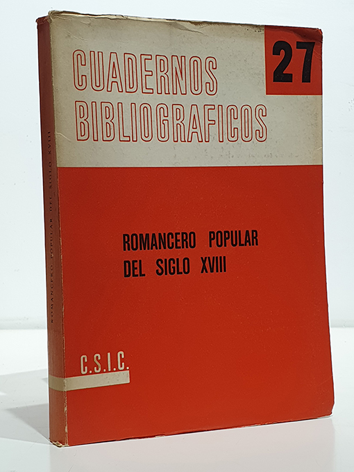 Publicado: Madrid: C.S.I.C. 1972 Autor: AGUILAR PIÑAL, Francisco. Título: ROMANCERO POPULAR DEL SIGLO XVIII. Cuadernos Bibliográficos 27. Encuadernación: Encuadernación de tapa blanda Estado: Muy bien Información adicional: 4to. XIX pp. + 313 pp. Encuadernación editorial. Perfecto estado, sin nombre anterior poseedor, ni otros defectos reseñables.