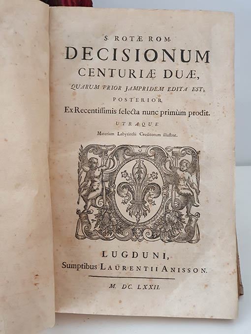 S. Rotae Rom. [Sacrae Rotae Romanae] Decisionum Centuriae Duae quarum prior iampridem edita est; Posterior Ex Recentissimus selecta nunc primum prodit. Utraque Materiam Labyrinthi Creditorum illustrat. JUNTO CON: Labyrinthus creditorum concurrentium ad litem, per debitorem communem, inter illos causatam. PARS QUARTA et ultima. [Correspondería con el tomo III de la obra, que contiene además: Opus posthumum ex ipso Authoris… huic accessit Tractatus de Libertate Beneficiorum, et Capellaniarum recuperanda, ab codem authore aliás concinnatus. Con paginación y portada propia.