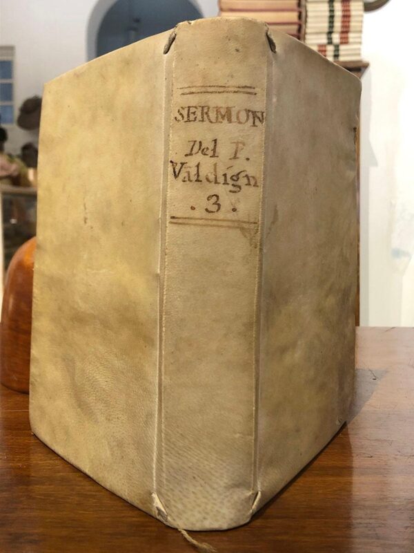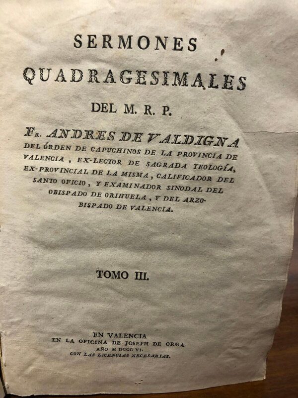 Publicado: Valencia: En la Oficina de Joseph de Orga, 1806 Autor: VALDIGNA, Andrés. Título: Sermones quadragesimales del M.R.P... Tomo III. Encuadernación: Encuadernación de tapa dura Estado: Aceptable Información adicional: 4to. menor, 605 pp. Pergamino de época. Un poco fatigado.