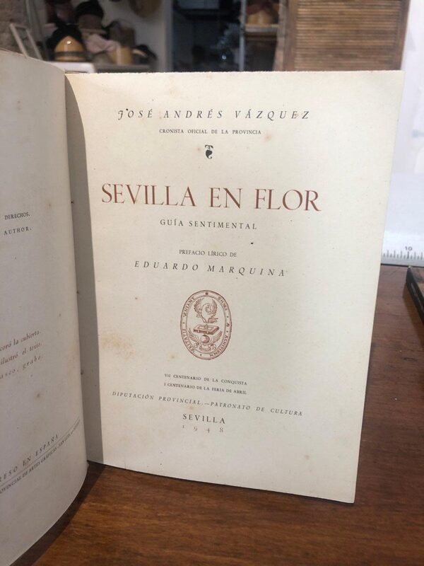 Publicado: Sevilla: Diputación Provincial, 1948. Autor: VÁZQUEZ, José Andrés. Título: Sevilla en Flor. Guía Sentimental. Prefacio lírico de Eduardo Marquina. Encuadernación: Encuadernación de tapa blanda Estado: Bien Información adicional: 4to. 178 pp. + 2 h. Encuadernación editorial original. Dedicatoria autógrafa del autor. Buen estado.