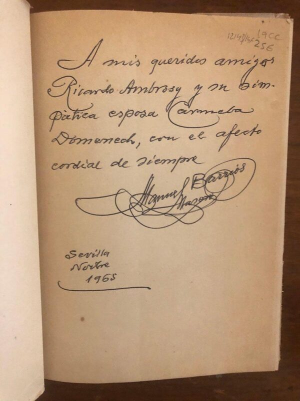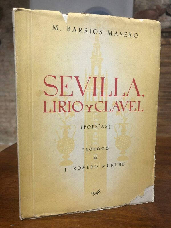 Publicado: Sevilla: Artes Gráficas ?, 1948 Autor: BARRIOS MASERO, Manuel. Título: Sevilla, lirio y clavel (Poesías). Prólogo de J. Romero Murube. Encuadernación: Encuadernación de tapa blanda Estado: Bien Información adicional: 8vo. 135 pp. + 3 h. Rústica con sobrecubierta. Dedicatoria autógrafa del autor. Sobrecubierta con roturitas marginales y alguna pérdida. Interior impecable.