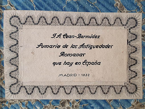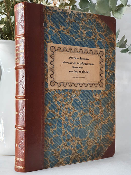 Publicado: Madrid: Imprenta de D. Miguel de Burgos 1832 Autor: CEAN-BERMÚDEZ, Juan Agustín. Título: Sumario de las antigüedades romanas que hay en España, en especial las pertenecientes a las Bellas Artes. Encuadernación: Encuadernación de tapa dura Información adicional: Folio, 2 h. + XXVIII pp. + 2 h. + 538 pp. Encuadernación holandesa de época con puntas, la lomera ha sido sustituida por una nueva dado el estado que presentaba. Mancha de humedad que desaparece por completo en la página II del prefacio. Por lo demás en perfecto estado, papel de gran calidad y todos su márgenes. Cortes sin desbarbar. Palau 50767.
