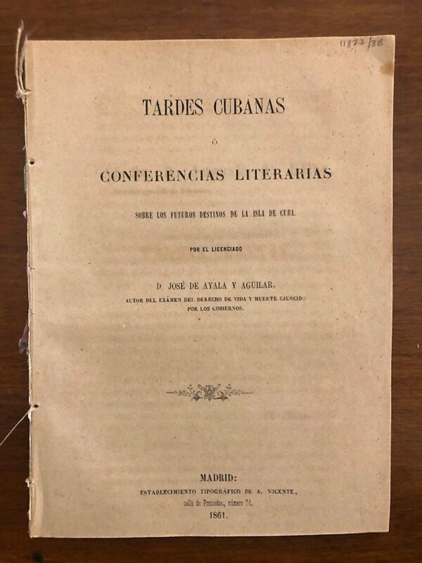 Publicado: Madrid: Establecimiento Tipográfico de A. Vicente, 1861 Autor: AYALA Y AGUILAR, José de. Título: Tardes cubanas o Conferencias Literarias sobre los futuros destinos de la Isla de Cuba por... Encuadernación: Sin encuadernar Estado: Aceptable Información adicional: 8vo.83 pp. Sin encuadernar. Presentado en cubiertas provisionales de papel de aguas. Buen estado. Contiene varias tablas.