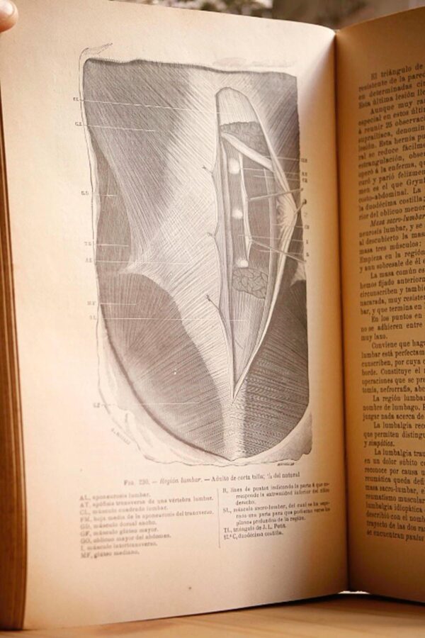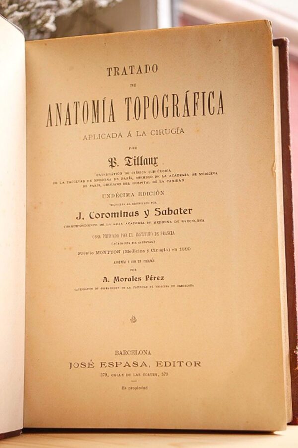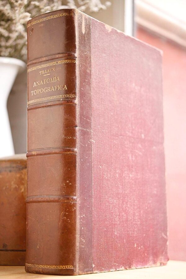 Publicado: Barcelona: José Espasa editor, s. f. c. 1890 Autor: TILLAUX, B. Título: Tratado de anatomía topográfica aplicada a la cirugía Encuadernación: Encuadernación de tapa dura Estado: Bien Información adicional: 4to. mayor, XXVII pp. + 1219 pp- Encuadernación holandesa con nervios. Tapas con rozaduras en puntas y base. Numerosas ilustraciones en negro y color. Buen estado general.
