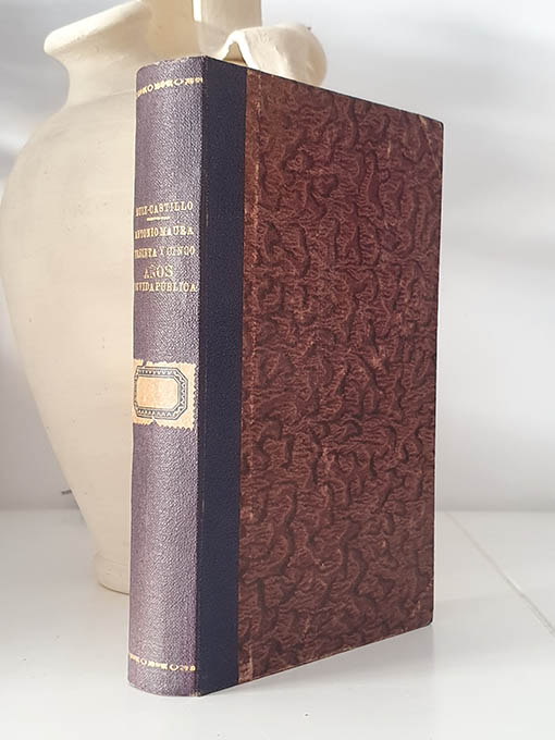 Publicado: Madrid: Biblioteca Nueva, s.f. Autor: MAURA, Antonio. Título: Treinta y cinco años de vida pública. I: Ideas políticas, doctrinas de gobierno y campañas parlamentarias. Recopiladas por J. Ruiz-Castillo. Encuadernación: Encuadernación de tapa dura Estado: Bien Información adicional: 8vo. 315 pp. + 2 h. Encuadernación en media tela de época no editorial. MUY BUEN ESTADO.