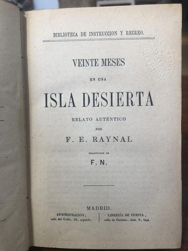 Publicado: Madrid: Administración, Librería de Cuesta. ca. 1875. Autor: RAYNAL, F.E. Título: Veinte meses en una isla desierta. Relato Auténtico. [Junto con:] La vida Militar en Prusia. Traducción de F.N. Encuadernación: Encuadernación de tapa dura Estado: Bien Información adicional: 4to. 225 pp. + 1h. Encuadernación holandesa de época. Buen estado.