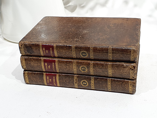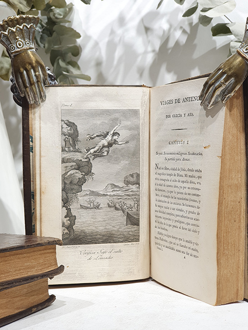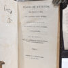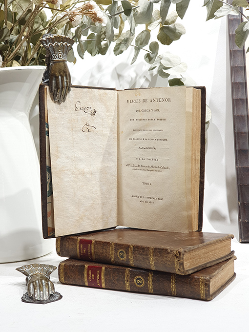 Publicado: Madrid: En la Imprenta Real 1802 Título: VIAGES DE ANTENOR POR GRECIA Y ASIA, CON NOCIONES SOBRE EGIPTO. Manuscrito Griego del Herculano, que traduxo á la lengua francesa E. F. Lanrier y á la Española D. Bernardo María de Calzada. 3 Tomos. Encuadernación: Encuadernación de tapa dura Estado: Muy bien Información adicional: 8vo. 1 grabado + XVIII pp. + 337 pp. II: 1 grabado + VI pp. + 356 pp. III: 1 grabado + VI pp. + 343 pp. Plena pasta española de época, alguna traza de polilla en cabeza del lomo que no llega en ningún caso a afectar a las páginas. En general papel limpio, encuadernación recia, piel con toda su flor... buen ejemplar.