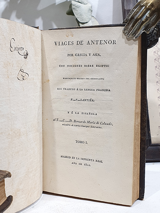 VIAGES DE ANTENOR POR GRECIA Y ASIA, CON NOCIONES SOBRE EGIPTO. Manuscrito Griego del Herculano, que traduxo á la lengua francesa E. F. Lanrier y á la Española D. Bernardo María de Calzada. 3 Tomos.