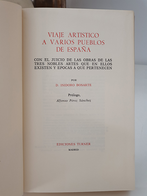 Publicado: Madrid: Turner 1978 Autor: BOSARTE, Isidoro. Título: Viaje artístico a varios pueblos de España con el juicio de las obras de las tres nobles artes que en ellos existen y épocas a que pertenecen. Encuadernación: Encuadernación de tapa dura Estado: Muy bien Información adicional: 4to. menor, 70 pp. + XVI pp. + 417 pp. Tela editorial. Perfecto estado, sin nombres, ni subrayados, ni defecto reseñable alguno.