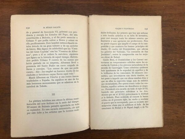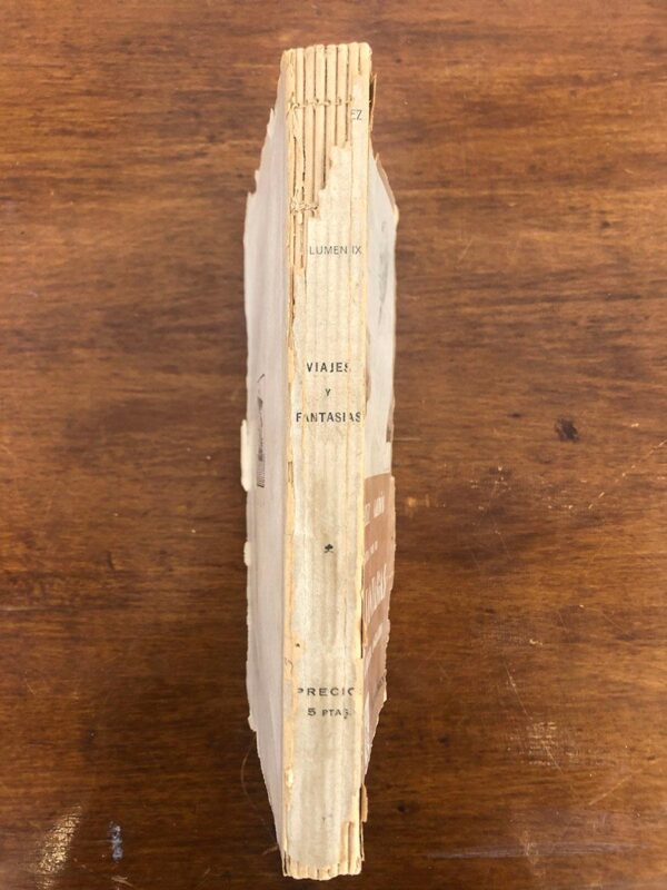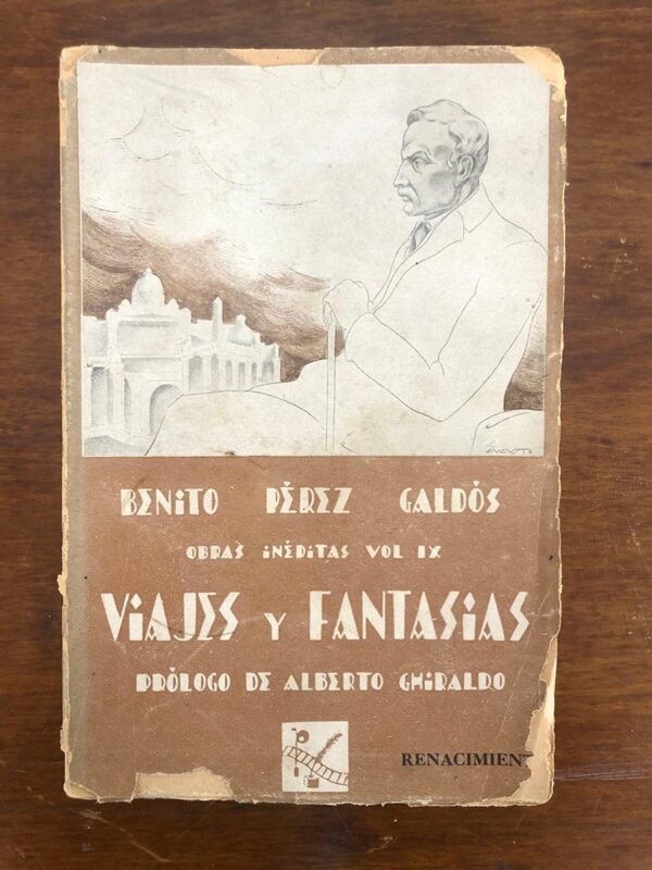 Publicado: Madrid: Renacimiento, 1928 Autor: PÉREZ GALDÓS, Benito. Título: VIAJES Y FANTASIAS. Obras inéditas. Ordenadas y prologadas por Alberto Ghiraldo. Obras inéditas, volumen IX. Encuadernación: Encuadernación de tapa blanda Estado: Aceptable Información adicional: 8vo. 2333 pp. + 5 h. Rústica, las cubiertas con roturitas y pequeñas pérdidas de papel en márgenes.