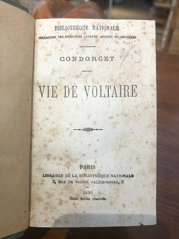 Publicado: París: Bibliotheque Nationale, 1880 Autor: CONDORCET, (Marie Jean Antoine N.Caritat, Marqués de) Título: Vie de Voltaire (1880) Junto a: VOLTAIRE, La Henriade; Junto a: Voltaire: Novelas. 2 tomos en francés y 1 en español en 1 volumen. Encuadernación: Encuadernación de tapa dura Estado: Bien Información adicional: 12vo. (14 x 9 cm.) I: 192 pp. II: 187 pp. + 1 h. III: 192 pp. Encuadernados en tela de época, no editorial. Buen estado, motas de óxido.