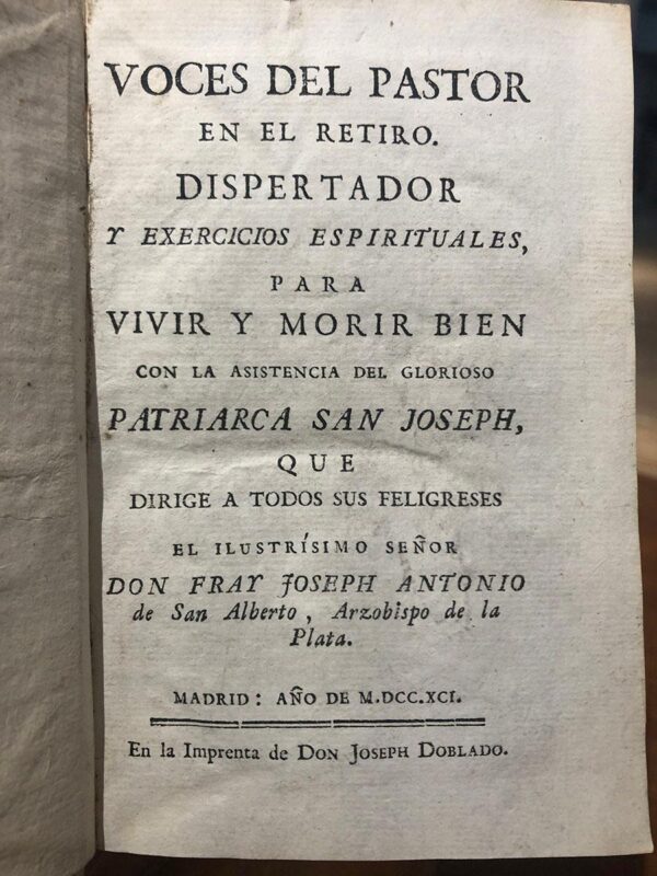 Voces del Pastor en el Retiro. Dispertador y Exercicios Espirituales para vivir y morir bien con la asistencia del glorioso Patriarcha San Joseph, que dirige a todos sus feligreses el Ilustrisimo Señor Don Fray José Antonio de san Alberto, Arzobispo de La Plata.
