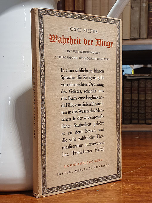 Publicado: München: Kösel 1951 Autor: Pieper, Josef. Título: Wahrheit der Dinge: eine Untersuchung zur Anthropologie des Hochmittelalters. Encuadernación: Rústica Estado: Muy bien Información adicional: 8vo. 144 pp. + 2 h. In original paper wraps with dustjacket. Very good condition [+]. Encuadernación editorial con sobrecubierta. Perfecto estado.
